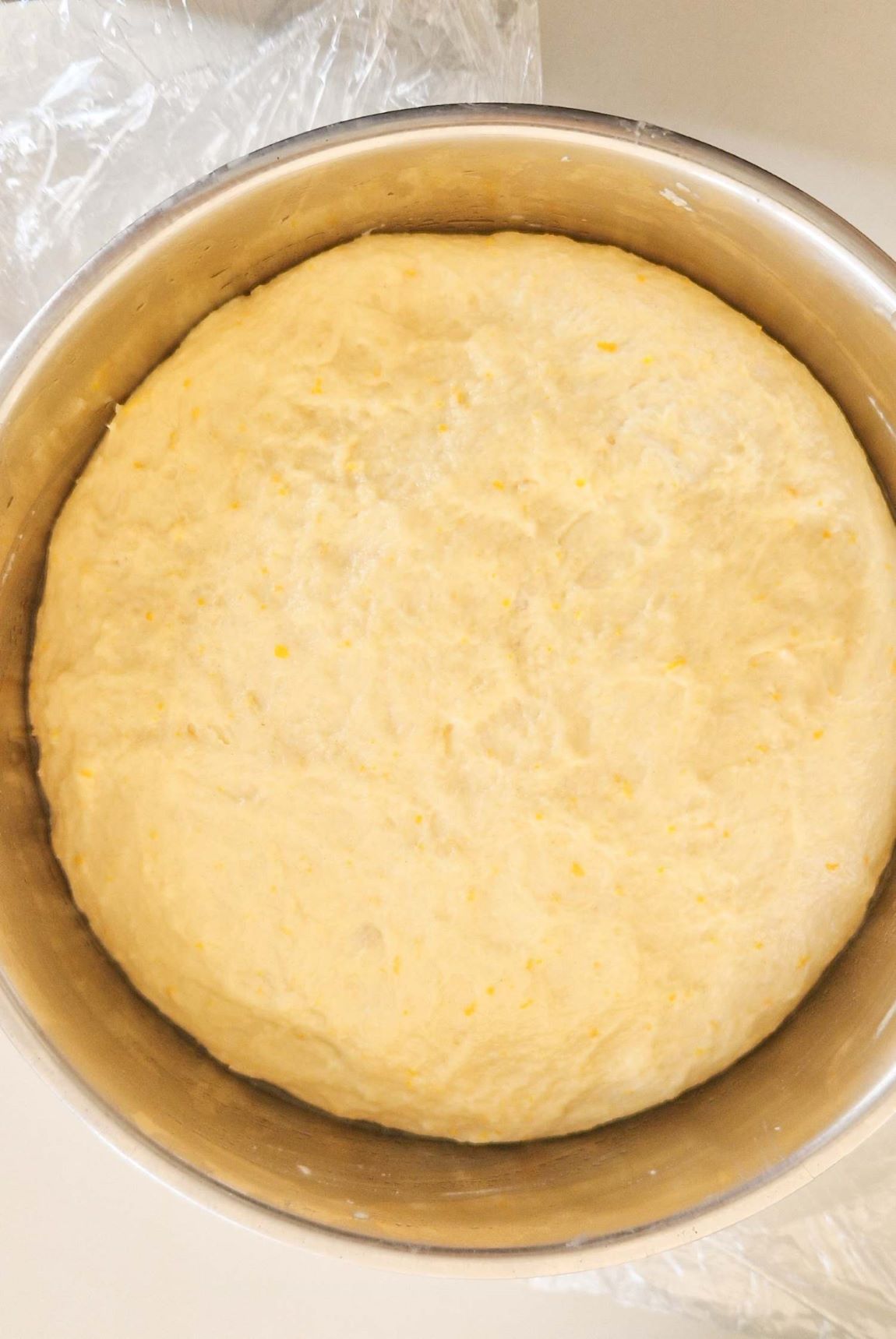 - Once the yeast is activated, add the remaining sugar, oil, and orange zest. Mix well.
